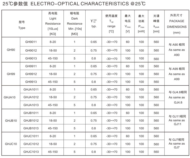 環(huán)保型光敏電阻系列RoHS Complicance Photocells Series